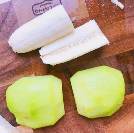 2、猕猴桃找一个稍微硬点的削皮后对半切开,香蕉半根对半切开