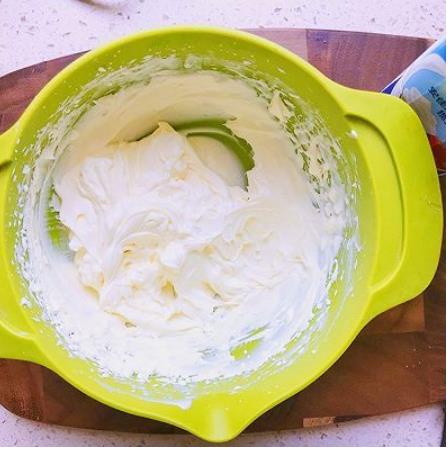 4、这个奶油很好打发哦 我用手抽打的,所以一定不要打过了!打发到光滑有硬度,挑起来有小尖即可!