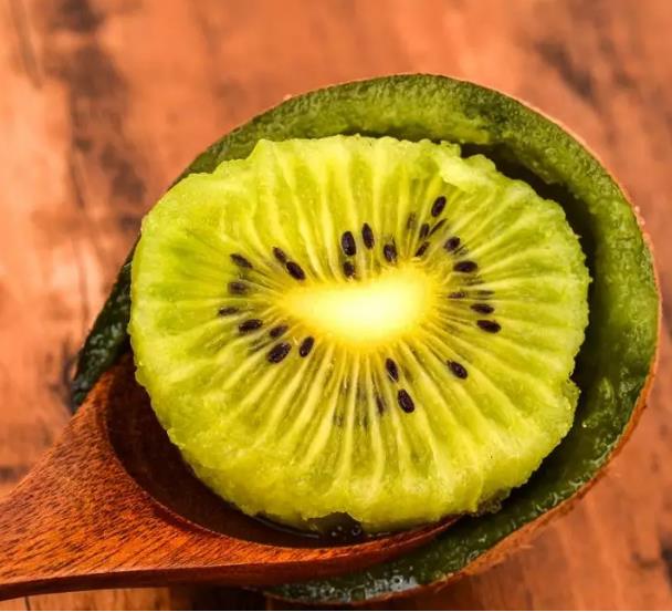 3、催熟后,用手指肚轻轻按压猕猴桃的两端附近,如果感觉不再坚硬,按压处有轻微的变形,但也不是很软,就是最佳的食用状态。把它切开,用勺挖食,正好酸甜适口。猕猴桃可以在饭后吃,它含有的大量蛋白酶可以帮助消化。