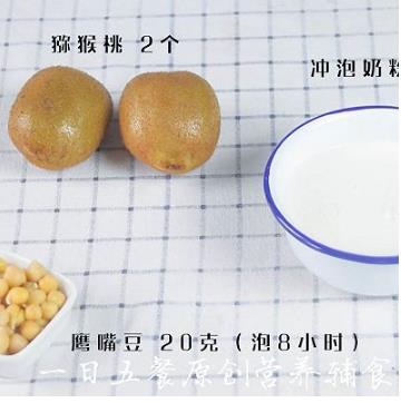 1、食材:鹰嘴豆 20克,猕猴桃 2个,冲泡奶粉 100克 烹制方法:搅打 参考月龄:8个月以上 所需时间:5分钟