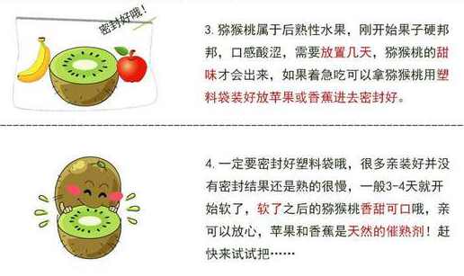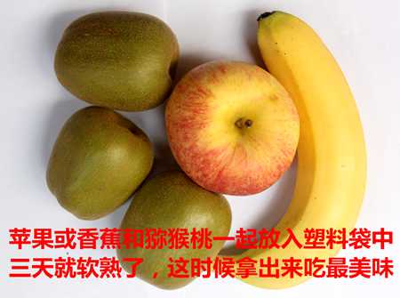 把猕猴桃鲜果装入塑料袋内,再把切开的香蕉或苹果同袋混装,然后将袋口密封3~5天,即可后熟食用。一般每公斤猕猴桃放一个切开的香蕉或苹果,装入的香蕉或苹果越多,催熟效果越好。经过后熟的果子如已变软,即可剥皮食用。对仍不能剥皮的可用切削皮食用。