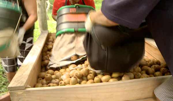 在采摘奇异果的时候,也讲究专业,注重细节。工人们采摘果实时,会在胸前背着一个巨大的口袋,装着摘下来的果实。把口袋挂在胸前,是为了保证摆放的时候不会伤到果子。