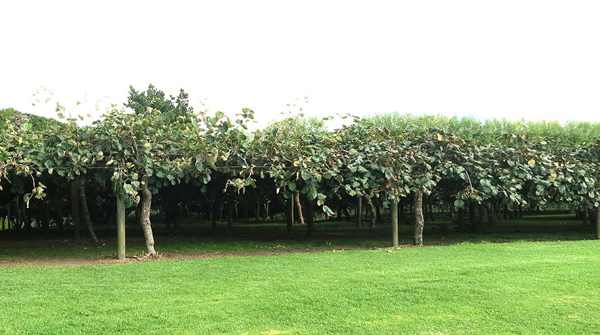 新西兰奇异果均采用大棚架,猕猴桃苗株行距5米×5米(或者6米乘4米),单主干上架,顺行向两主蔓分两边单轴延伸,结果枝密度大,摆放科学,更新合理;不论是主干还是结果母枝、结果枝,长势健壮,30年的树上下均出现老化现象,无结果部位外延现象;果园采用了微灌溉技术,整个生产过程打药6~7次,施肥以动物有机肥机械穴施为主,修剪的枝条等经过粉碎全部还田。先生还就环割技术、摘叶与反光膜使用技术、果园地面草管理技术等进行了说明。