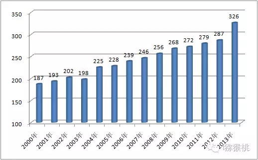 图1、2000-2013年全球猕猴桃生产情况(单位:万吨)