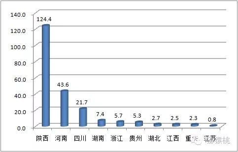 我国是猕猴桃的原产地,广泛分布于中国南方山岭之间。近几年来,猕猴桃产业发展迅速,2015年猕猴桃产量已经达到219万吨,其主要分布在陕西(124万吨)、河南(44万吨)和四川(22万吨)等地,三省约占全国总产量的86.7%,其中陕西一省就超过全国产量的一半以上。具体看陕西猕猴桃主要分布在西安市周至县、户县、宝鸡市眉县、咸阳市武功县一带;河南猕猴桃主要分布于西峡县以及桐柏山地区;四川主要分布在川西龙门山脉、邛崃山脉等地带。此外广大的长江中上游地区猕猴桃产业发展也非常迅速。