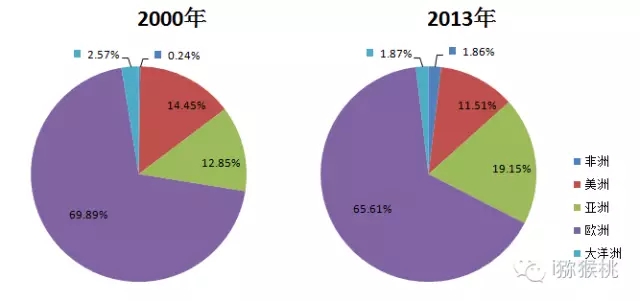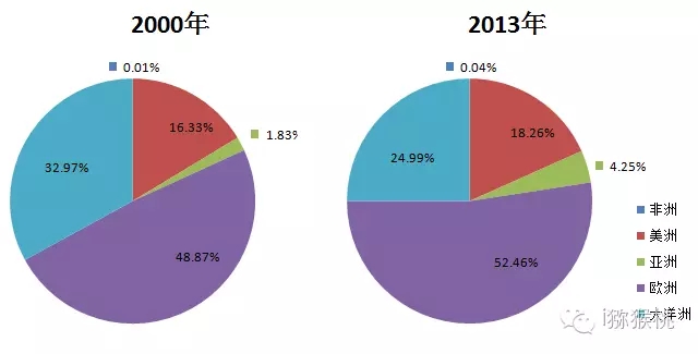 图4、2000年、2013年全球猕猴桃出口目的地分布变化情况