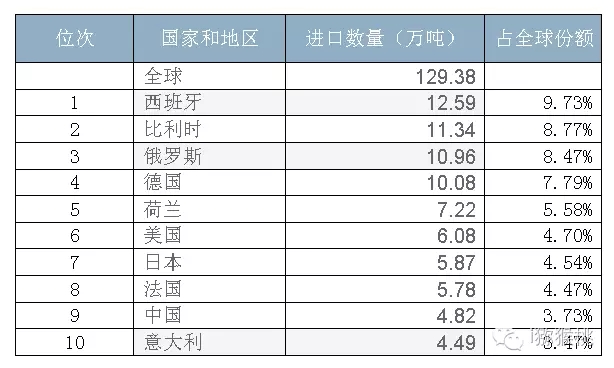 分国别看,2013年进口前十位的国家分别是西班牙、比利时、俄罗斯、德国、荷兰、美国、日本、法国、中国和意大利,以欧洲国家为主,少数分布于北美和东亚地区。