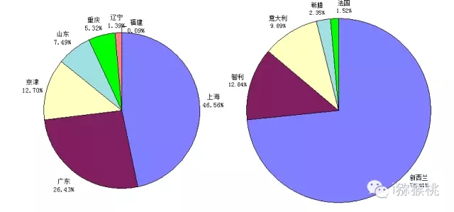 从进口来源国看,我国猕猴桃进口主要来自于新西兰、智利和意大利,2015年进口量分别为6.62万吨、1.16万吨和0.89万吨,三国占进口总量的96.1%。从国内进口地区分布看,主要集中沿海大城市,其中2015年上海、广东、京津地区进口分别为4.20万吨、2.38万吨、1.15万吨,三地占进口总量的85.7%。