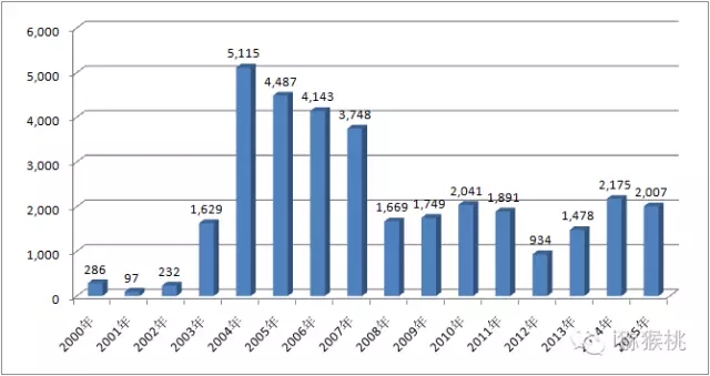 图8、2000-2015年中国猕猴桃进口情况(单位:吨)