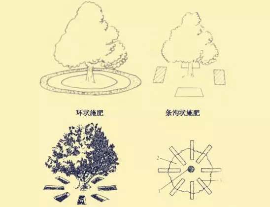 生产上多结合深翻改土,采用环状沟施、放射状沟施、条沟施肥等方式。