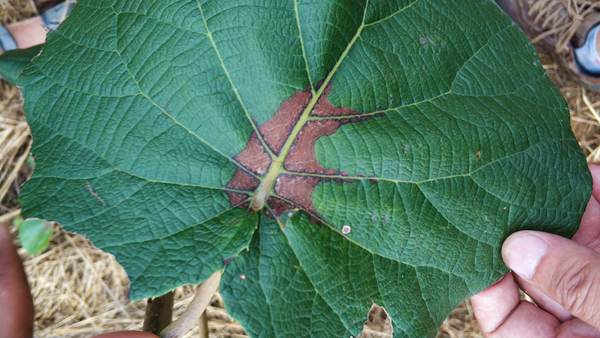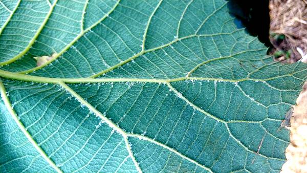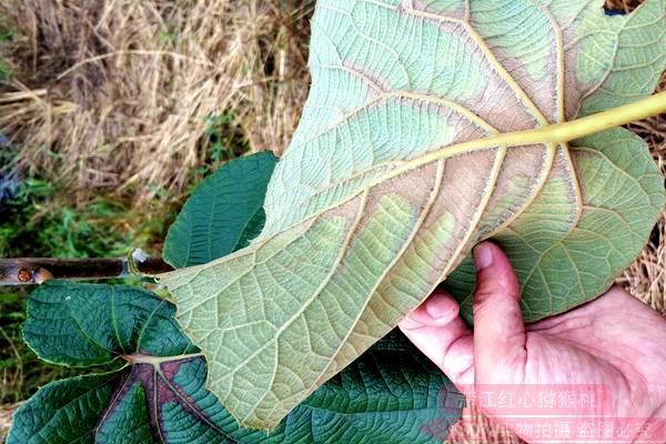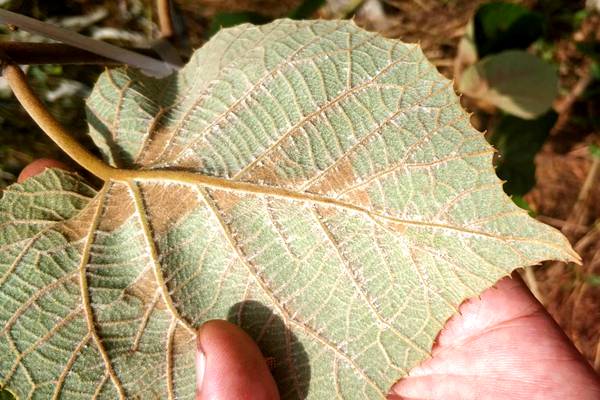 白粉病是特别普遍的一种真菌性病害,主要危害猕猴桃叶片。在刚刚感染白粉病的时候,表现在猕猴桃叶片背面叶脉两边出现针尖大小的白色菌斑点,沿叶脉两侧排列成行。而叶片正面表现为叶脉最先变为黑褐色,随着病菌扩展,沿叶脉出现不规则棕褐色病斑。发病后期,正面黑点逐渐扩散连接,导致局部叶片组织坏死,受害叶片最终卷曲、干燥枯萎枯情况,比较容易的脱落。