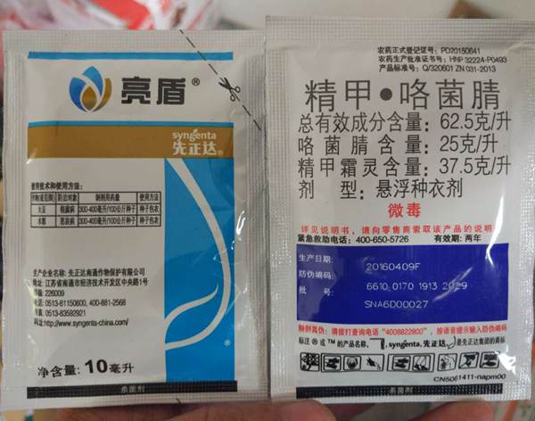 亮盾是先正达公司生产的种子处理杀菌剂,我们主要使用在猕猴桃苗木侵根和灌根上面。