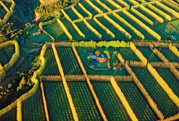 在风速大于10m∕秒的地方建园,应同时建防风林,或先建防风林后建园,一般防风林建两排,乔、灌木结合,较大果园内应栽防风带。下图是新西兰的阳光金果和魅力金果园,每个果园面积控制在20-100亩,四周都有高达8米的乔木做防风林。