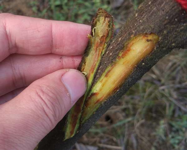 (猕猴桃树皮呈现铁锈色,木质部逐渐变为黑褐色,失去传递养分能力)