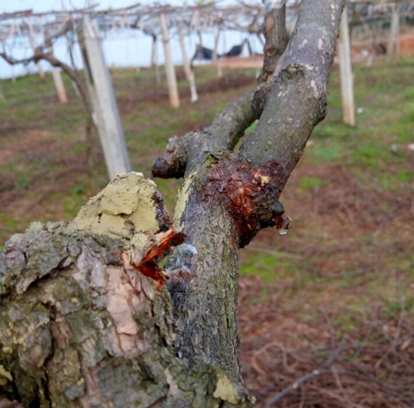 (贵州遵义务川县海拔1300米的贵长猕猴桃果园,在三月下旬至五月份,与植物伤流混合后,形成黄褐色或铁锈红色,韧皮部溃疡腐烂)