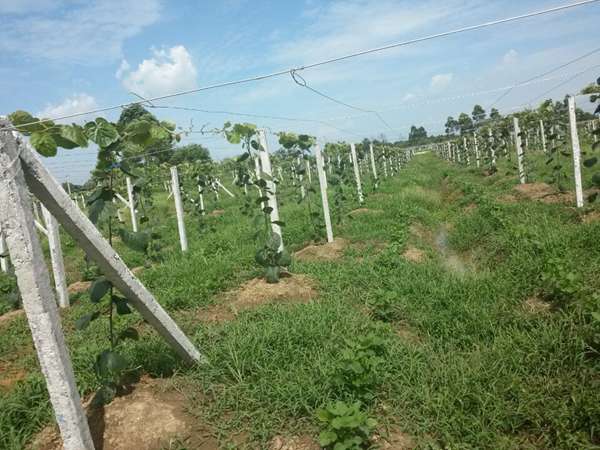 顺树行每隔6米栽一立柱,立柱地面高1.8米,地下埋入0.6米,立柱上设一横梁,形成“T”型支架,横梁长2米,上面顺行固定5条2.4毫米热镀锌钢丝,中心一条架设在立柱顶端。植株上架后2个主蔓分别沿中心铅丝伸向两边,结果母枝从主蔓发出后分别伸向两侧,下垂到行间。