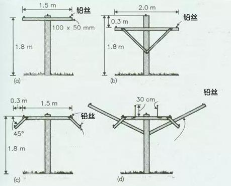 所用立柱的规格和栽植距离等同“T”型架,但立柱上不使用横梁,而是用方钢条或钢绞线等将全园的立柱横拉在一起,三角铁上每隔50~60厘米顺行架设1条直径两毫米热镀锌钢丝。植株上架后2个主蔓分别沿中心铅丝伸向两边,结果母枝从主蔓发出后分别伸向两侧。