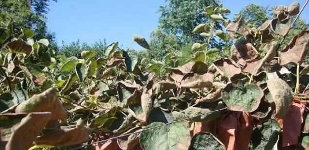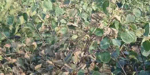 在猕猴桃生长季节,当35℃(含35℃)以上温度连续出现10-40小时且伴随干旱,导致植株出现一系列生理病变,如果实、叶片、枝干组织坏死等日灼症状,统称为热害。