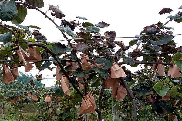 4、果实早套袋,防日烧。高温期易发生日烧,可采用果实套袋或遮荫预防日烧。重点套西南方向和上部的果实。套袋应在早晨露水干后或药液干后进行,雨后也不宜立即套袋,等果面露珠干了后再套,近年来蒲江普遍采用了猕猴桃套袋技术。阳光太强烈的地方,可以考虑搭遮阳网。