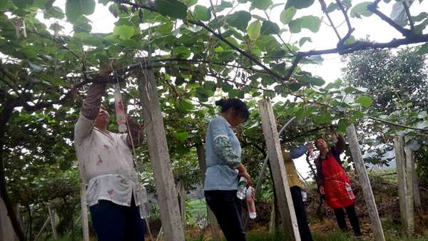 为保证果子在一个安逸、舒适、无菌清洁环境生长,我们需要给猕猴桃宝宝穿上特别外套。穿衣前我们需要给它制造一个相对独立的无菌环境,就是喷施套袋药品。