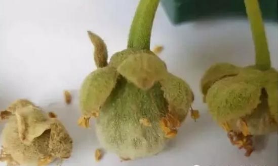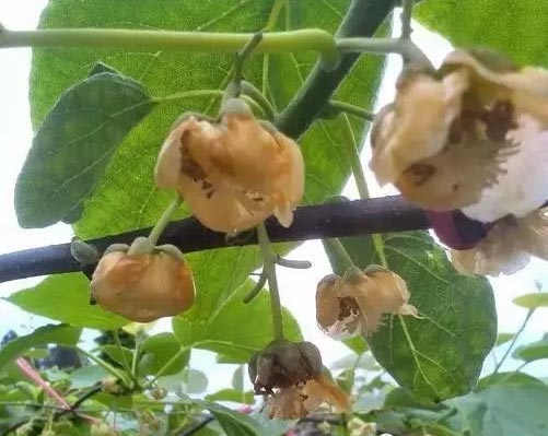 近几年猕猴桃细菌性花腐病发生较普遍,尤其是花期较早的品种如红阳更容易感病,其病原菌为假单胞杆菌(Pseudomonas viridiflava),发病初期感病花蕾、萼片上出现褐色凹陷斑,斑块很快发展,当病菌侵入到花蕾内部时,花瓣变为桔黄色,开放时呈褐色并开始腐烂,花很快脱落。受害不严重的花也能开放,但花药花丝变成褐色或黑色后腐烂。