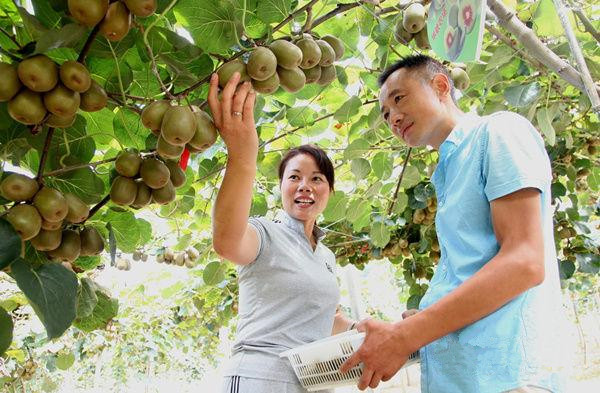 张华2013年承包荒山荒田种植红心猕猴桃,现已形成130亩的家庭农场猕猴桃基地,今年有200多北京、浙江、江苏等城市的市民通过微信认养红心猕猴桃,恰好又是一个丰收年,认养人不仅可以随时到地头采摘,还可以让农场工作人员帮助采摘快递。