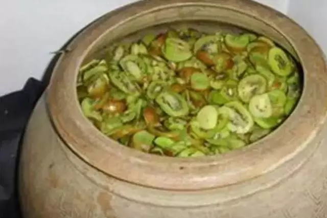 1、将催熟好的猕猴桃两头削掉,切片放在坛里发酵。