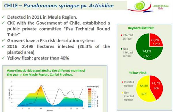 Mr.Carlos Cruzat透露了一个重要的信息,智利猕猴桃正在遭受一种假单胞菌的威胁,2016年已经有2498公顷猕猴桃被感染(占种植面积的26.3%)。智利为了应对这一情况专门成立Psa风险描述系统,希望能够缓解这一糟糕的情况。
