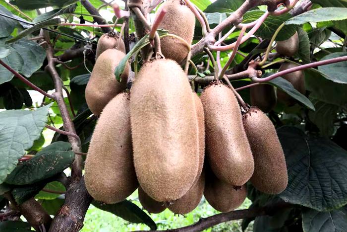 谈到金福猕猴桃有什么特点时说,这个品系生长快,但徒长枝相对少,管理简单,在贵州遵义5月初开花,10月中、下旬果实成熟,亩产可达两千公斤。同时,该品系阳光金果猕猴桃果皮呈黄褐色、果面有淡灰色硬短毛,果肉翠绿色,肉质细而多汁,果味甜中带酸,风味浓郁可口。据检测中心检测,该品系成熟后可溶性物质19.6%~23%,VC172毫克/100克鲜果,总酸1.26%;耐贮运,货架期可达30~50天;果实不失水,不变形,不变味。