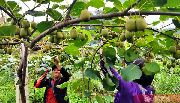 猕猴桃含有丰富的碳水化合物、维生素和微量元素,尤其是维生素C的含量是苹果的十倍左右,被誉为“维生素C之王”,具有降低胆固醇、促消化、降血脂等多重功效。自2013年由新邵县玉辉农林开发有限公司引进的猕猴桃特色产业落户潭府后,通过多年精心经营,已成为全县知名的产业扶贫企业。玉辉农林采用“公司+合作社+基地+农户”的产业化运作模式,现已投入资金5500余万元,流转土地4000多亩,长期委托帮扶潭府乡、太芝庙镇、潭溪镇贫困人口2278户8710人,每年可为贫困群众创收400多万元。在樟树村,玉辉农林打造的3A级农业旅游景区“普悦精灵果果乐园”正在加紧施工,该基地集蓝莓等精品水果种植采摘、生态旅游、研学教育于一体,第一期占地面积1306亩,计划在今年内正式开园,每年为群众创造数千个就业岗位。