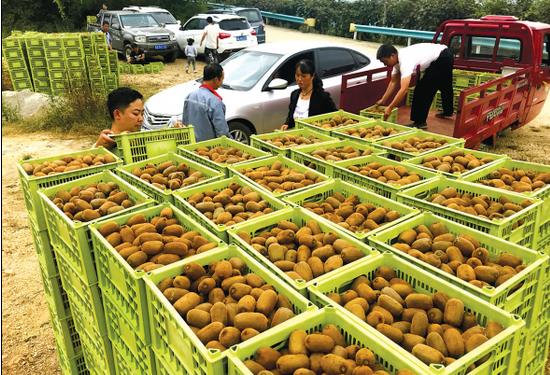 10月7日,都市新闻记者在修文县洒坪镇阳桥村的几个猕猴桃基地看到,近30名果农正在果园里抢收猕猴桃装车外运,这里的16万斤猕猴桃找到了买家。