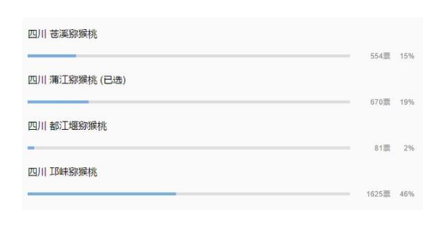此次的投票会是以蒲江猕猴桃和苍溪猕猴桃为首的“百家争鸣”的局面,然而结果非常出人意料,投票区出现了一面倒的情况,“名不见经传”的邛崃猕猴桃以46%、接近一半的得票率拔得头筹,压过了往年牢牢占据“霸主地位”的蒲江猕猴桃和苍溪猕猴桃。