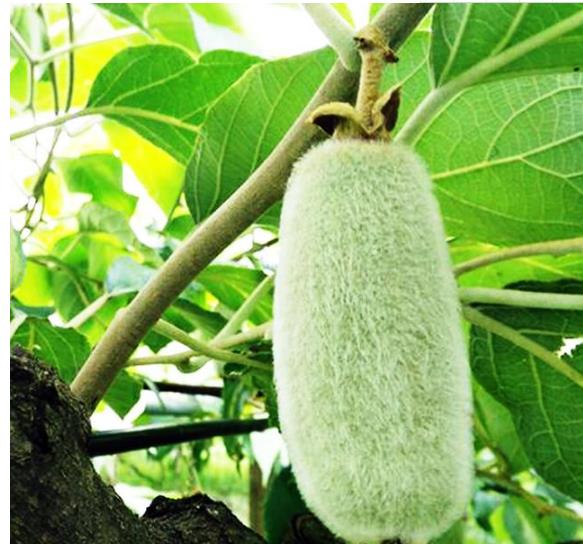 果实长圆柱形稍偏,果皮绿褐色,密裹灰白色长绒毛,平均果质量84kg 左右,最大单果质量122g 。果肉翠绿色,髓射线明显,肉质细腻,略酸,品质上等。可溶性固形物17% ,总酸11.11g/kg 。鲜果肉 Vc含量 450~560mg / 100g ,含糖量 8.3% 。果实 10 月下旬成熟,果实常温下可贮藏1个月,冷藏期4个月以上。并且能够在树体上软熟,采摘后直接食用。