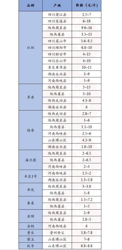 随着上市的猕猴桃越来越多,各大产地和市场的总体价格皆呈下降趋势。价格的变化主要以市场为导向,不同品种的猕猴桃价格有所不同(目前红阳、翠香、贵长、软枣等价格较为良好),同一品种也由于产地供应量及品质等原因价格存在差异;在批发市场端,受猕猴桃品种、品质及市场地域原因影响,猕猴桃的价格也有较大差距。