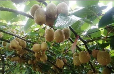 猕猴桃生长在山地里,受西南地区丰沛雨露的滋养。绿荫中,一个个胖乎乎的猕猴桃果悬挂下来,带着滴滴水珠,在阳光下闪闪发亮。