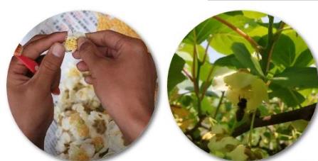 猕猴桃雌雄异株,需要借助蜂蝶和人工授粉才能成功挂果。4月开花,最佳花期只有短短的36小时,可谓是水果界的“昙花”。蒲江春季多雨,除了在果园布置蜂箱,还必须有经验丰富的果农抓紧时间进行人工授粉。